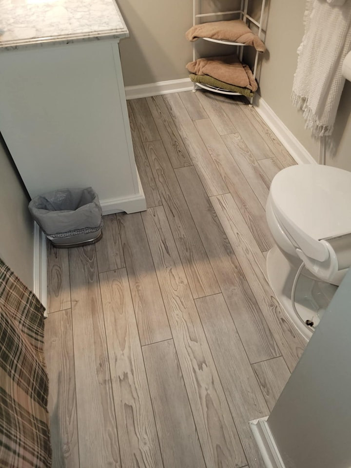 We installed an affordable wide-plank LVP floor system in light gray. The transformation was completed with new very light blue wall paint.